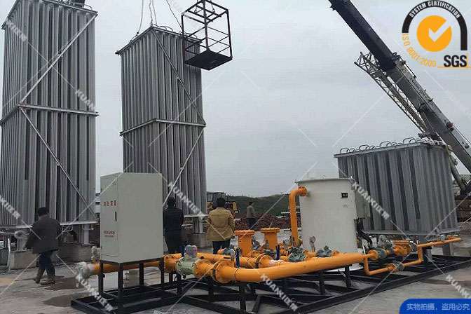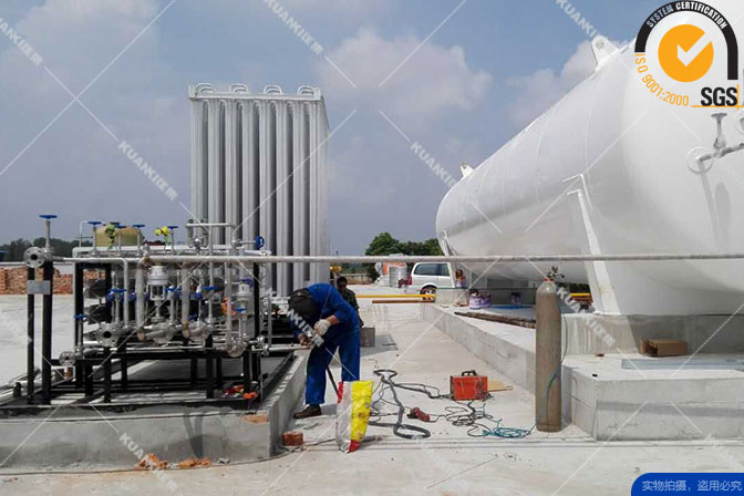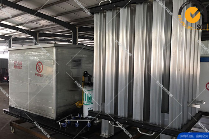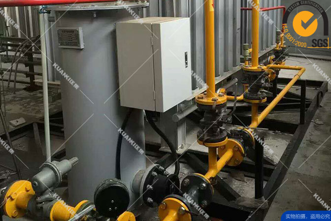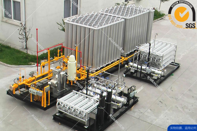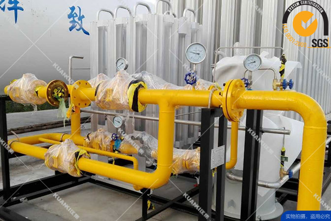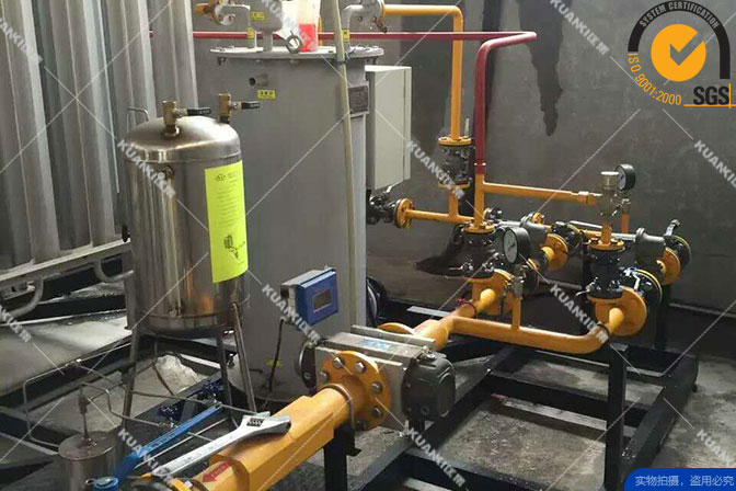 调压计量撬,一种撬块式燃气调压计量装置,由矩形撬块、调节汇管、控制阀、计量管、流量计、调节阀、调节管、过滤器、出气管、进气汇管、进气口、出气汇管、排污管和放气阀组成,其特征在于进气汇管、出气汇管和调节汇管平行排列在矩形撬块上,且与矩形撬块横向平行,调节汇管在前,出气汇管在中,进气汇管在后,在进气汇管和调节管两端之间水平设有两条并联计量管,在每条计量管上逐序设有控制阀、过滤器、压力表、流量计和控制阀;在出气汇管和调节汇管中部之间水平设有两条并联调节管,在每条调节管上逐序设有控制阀、压力表、调节阀和控制阀;在出气汇管上中部设有带90°弯头的出气管,在进气汇管中侧部设有一个进气口;进气汇管和出气汇管上安装安全放气阀。